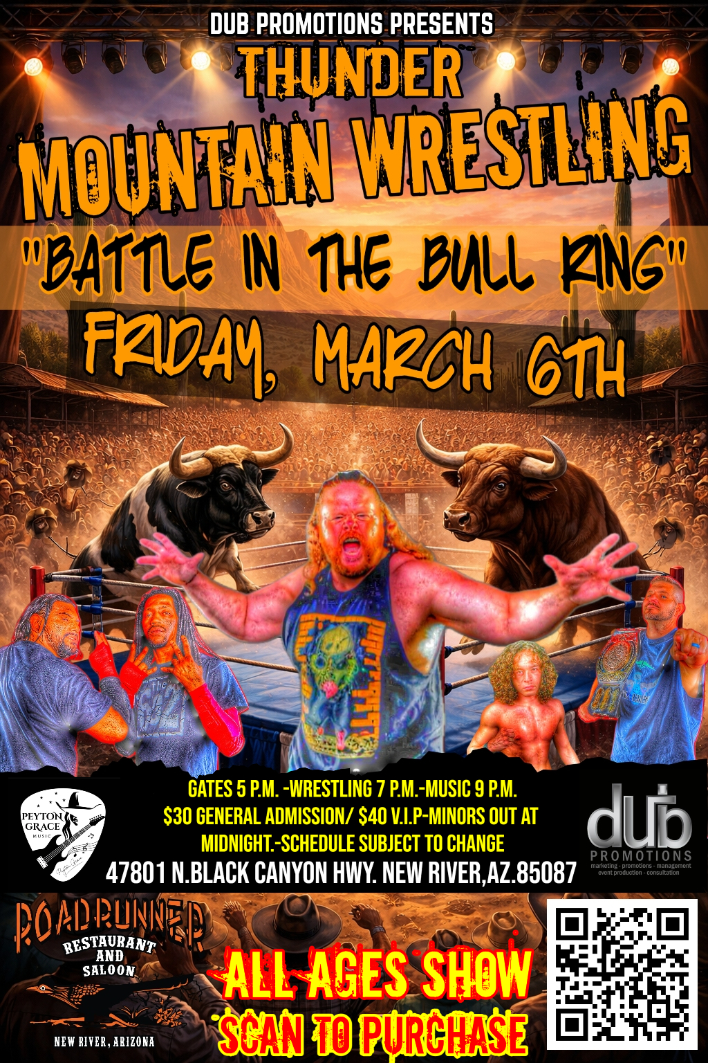 On March 6th, Thunder Mountain Wrestling storms into the legendary Roadrunner Restaurant & Saloon with a full-throttle Rodeo Arena spectacular, delivering hard-hitting, old-school professional wrestling in one of Arizona’s most rugged, high-energy venues.