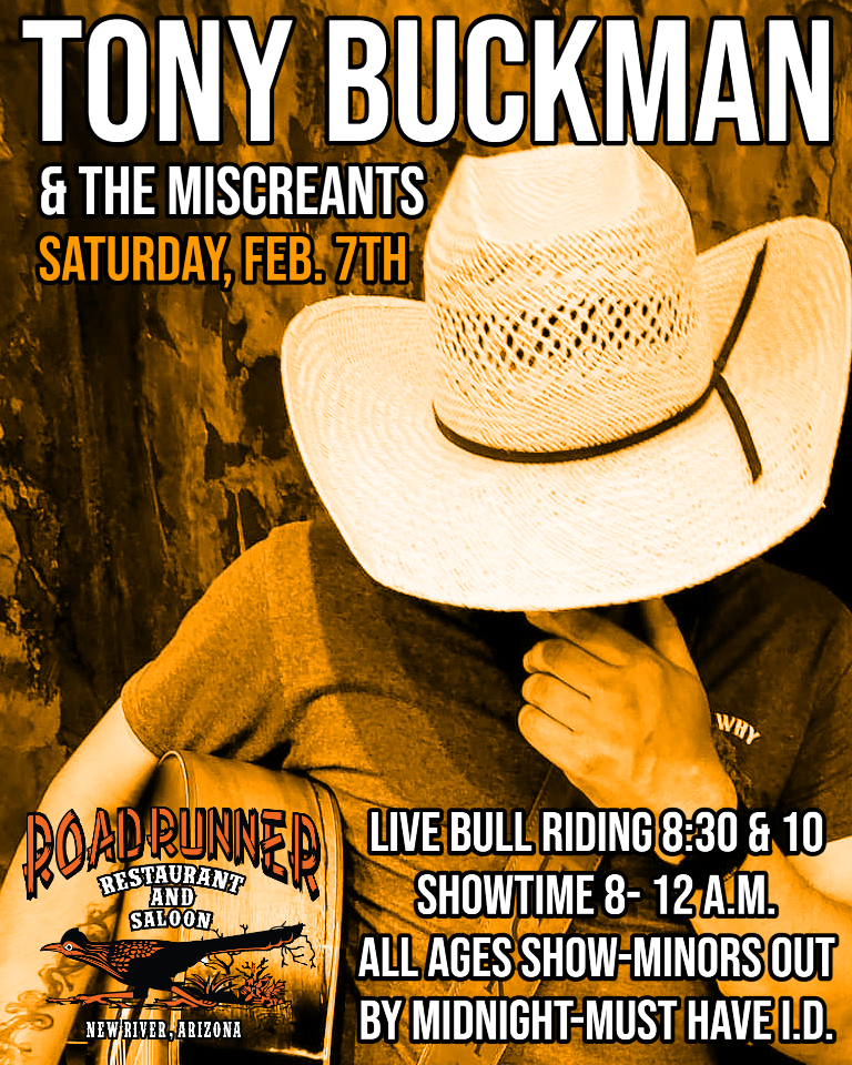 We love it when we get real deal Cowboys turned artist bringing us some real deal Country rockin' music. Former Bareback Rider turned troubador Tony Buckman headlines the evening with two rounds of live Bull Riding action. From the Pacific Northwest, and now making his way in the great state of Arizona, this former Rodeo hand puts on a show. Don't miss out on a real one, and one of our favorite type of shows.